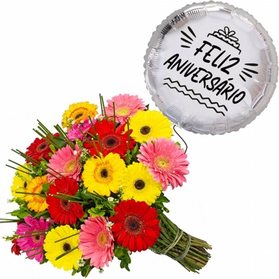 18 Gerberas Coloridas com Balao "Feliz Niver Prata"