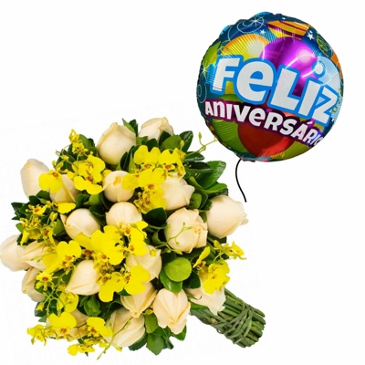 Luxuoso, assim podemos definir o Buque 20 Rosas com Orquídea Chuva de Ouro e Balão "Feliz Aniversário". O mimo perfeito para alguém especial. Por ser tão belo, o arranjo ainda pode decorar diversos ambientes, proporcionando um toque especial. Embalado em papel celofane e um delicado laço de ráfia. Composto por 20 Rosas Champanhe tipo exportação, 1 maço de Orquidea Chuva de Ouro, Folhagens e um Balão "Feliz Aniversário".