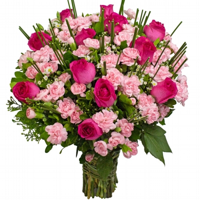 Buque de Rosa Pink com a suavidade da Cravina Cor de Rosa para presentear com sofisticação. Embalado em papel celofane e um delicado laço de ráfia. Composto por 12 Rosas Pink tipo exportação e 1 maço de Cravina Cor de Rosa, junco, aster e folhagens.
