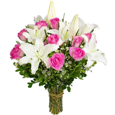 Delicado Buque Romance de Rosas Cor de Rosa Mesclada com Lírios Brancos. Cuidadosamente preparada com muito carinho para deixar o dia da pessoa que você adora mais especial. Embalado em papel celofane e um delicado laço de ráfia. Composto por 12 Rosas Cor de Rosa Mesclada tipo exportação e 7 Flores de Lírio branco, junco, aster e folhagens.
