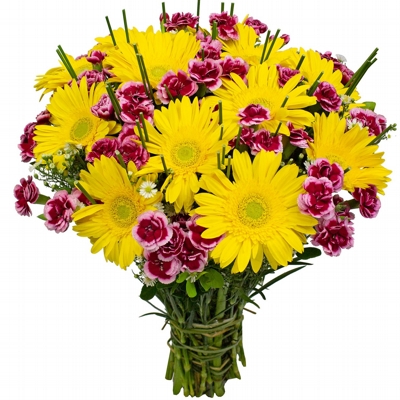 Não há quem resista ao Buque Carinho de Gérberas com Cravina bordô, uma combinação perfeita para presentear aquela pessoa especial. Embalado em papel celofane e um delicado laço de ráfia. Composto por 12 Flores de Gérberas amarelas e 15 Hastes de Cravina bordô, junco, aster e folhagens.