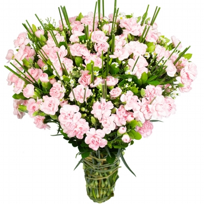 Com cores suaves o buque de Cravina Cor de Rosa é ideal para presentear com carinho e elegância. Embalado em papel celofane e um delicado laço de ráfia. Composto por 30 hastes, junco, aster e folhagens.