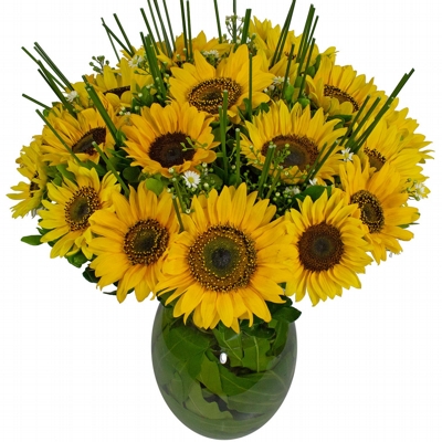 Deseje toda energia positiva e felicidade com este lindo Buque Esplendido de Girassóis em um sofisticado vaso de vidro. Flor conhecida por sua beleza e exuberância e por estar sempre na direção do sol. Embalado em papel celofane e um delicado laço de ráfia. Composto por 18 Flores.
