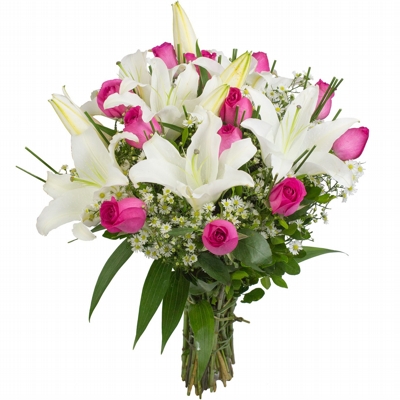 Impossível não se encantar com o Buque Esplendido de Lírios com Rosa Pink e deixar o momento ainda mais especial . Embalado em papel celofane e um delicado laço de ráfia. Composto por 12 Rosas pink tipo exportação e 7 Flores de Lírio Branco, junco, aster e folhagens.