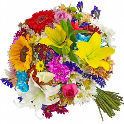 Exótico Buquê Festival de Flores Coloridas montado com carinho para presentear aquela pessoa especial. Embalado em papel celofane e um delicado laço de ráfia. Composto por 12 Flores de Flores do Campo, Lírios, Rosas, Gérberas coloridas.
