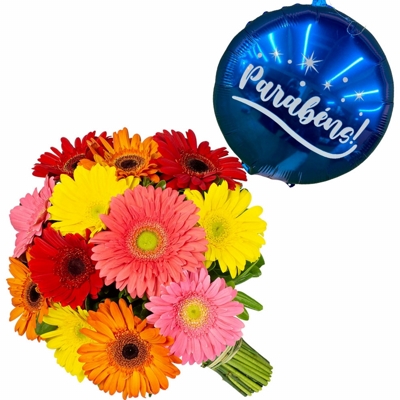 Mix 12 Gerberas Coloridas com Balao "Parabens"