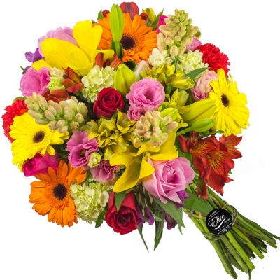 Buquê Premium de Flores Coloridas montado com carinho para presentear aquela pessoa especial. Embalado em papel celofane e um delicado laço de ráfia.