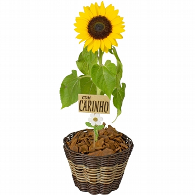 Deseje toda energia positiva e felicidade com este lindo Solitário de Girassol acomodado em um lindo cachepô de vime marrom, decorada com casca e uma delicada plaquinha "Com Carinho". Flor conhecida por sua beleza e exuberância, e por estar sempre na direção do sol. Embalado em papel celofane e um delicado laço de ráfia.