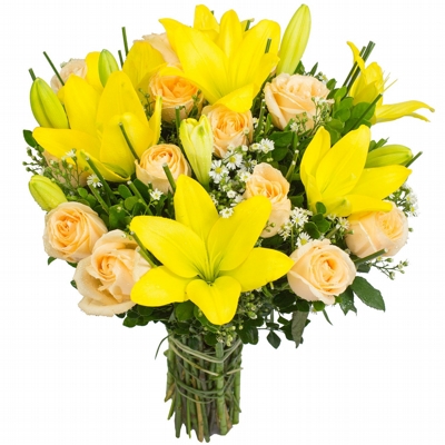 Impressionante Buque Surpresa de Lírios Amarelos com Rosa Champanhe tipo exportação para presentear com requinte e elegância. Embalado em papel celofane e um delicado laço de ráfia. Composto por 12 Rosas champanhe tipo exportação e 7 Flores de Lírio amarelo junco, aster e folhagens.